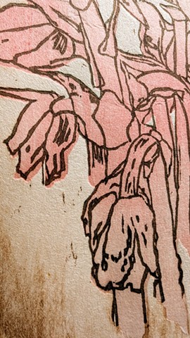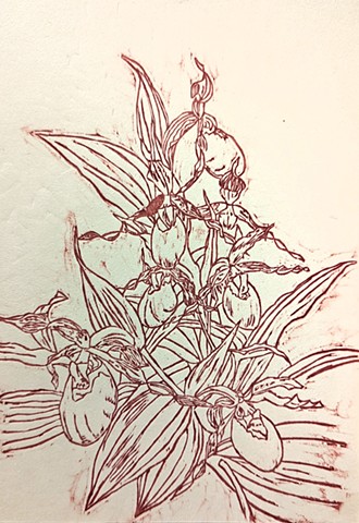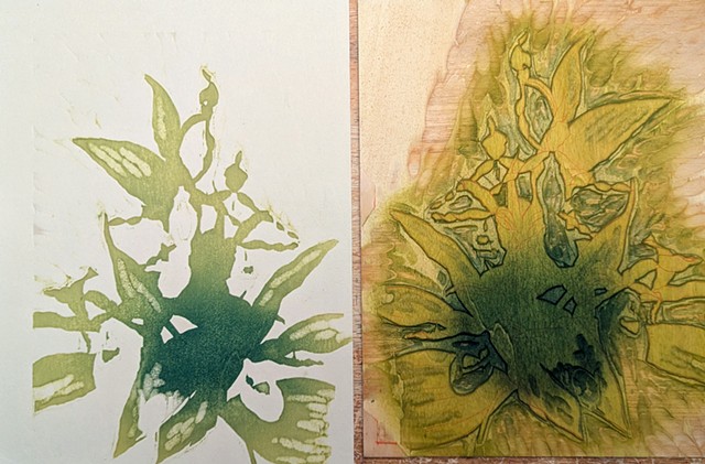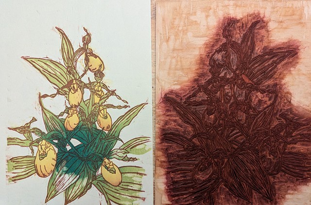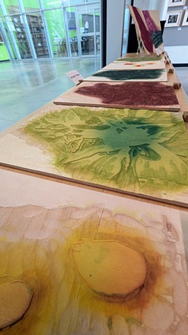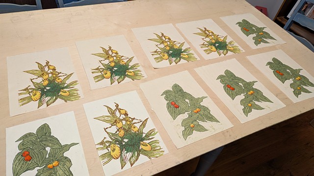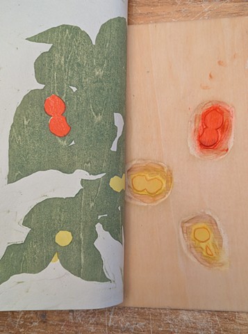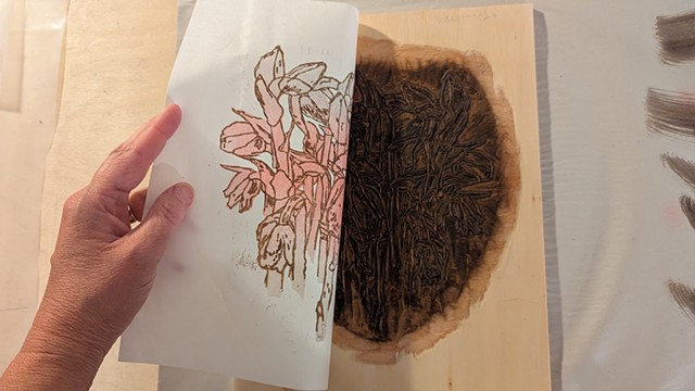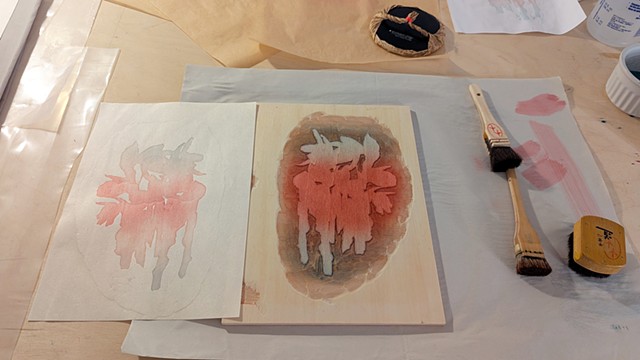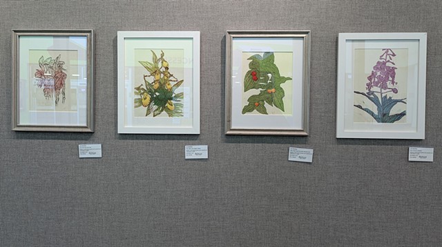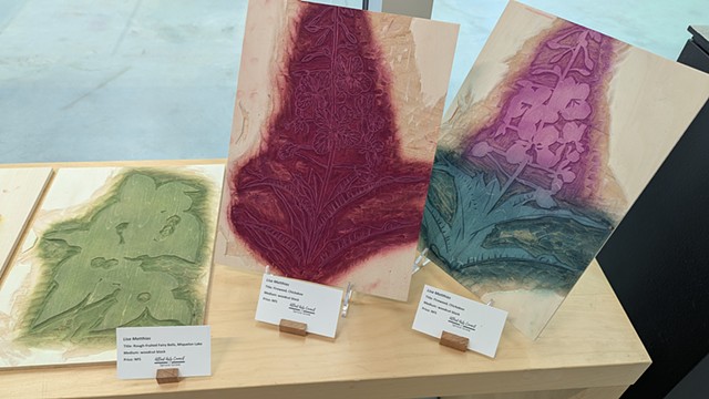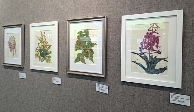 For the colour woodcuts in this exhibition I chose to several endemic flowering plant species from different natural areas around where I live, to highlight biodiversity, the beauty of these flora, their ecological significance and resilience, and the conservation of natural areas. I carved and printed these works using the water-based Japanese-style woodcut printmaking (mokuhanga) that I studied in Echizen, Japan. I displayed both the prints and carved woodblocks.