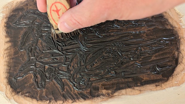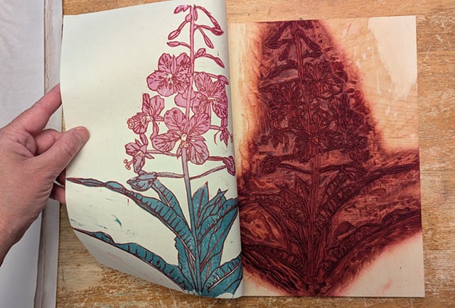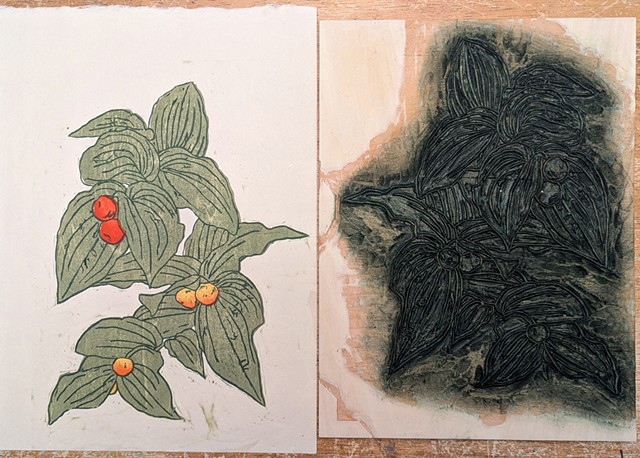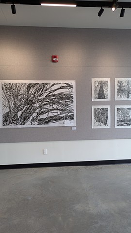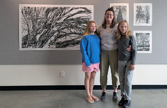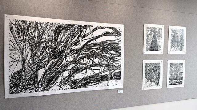 The large, 5-foot-long black-and-white woodcut in this show is of a twisted and gnarled old willow tree in our yard that my children have played on and around for many years. I love it’s endless winding branches, the habitat it provides for many lichens and mosses, birds and insects, deer and mammals, and the fact that it still blooms each spring, despite appearing mostly dead.